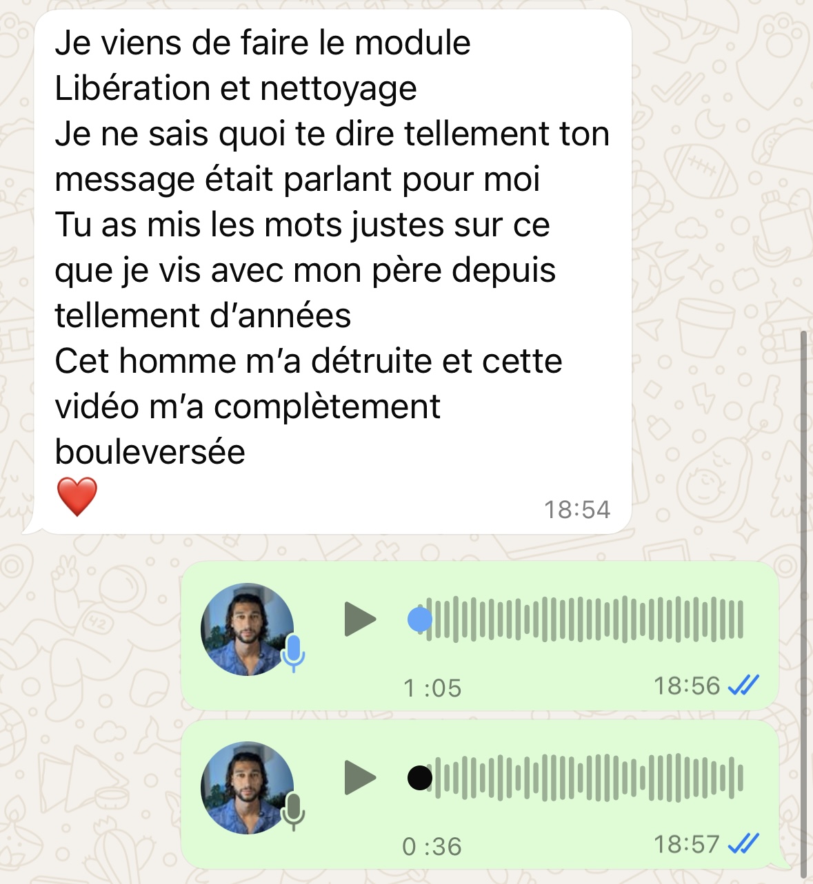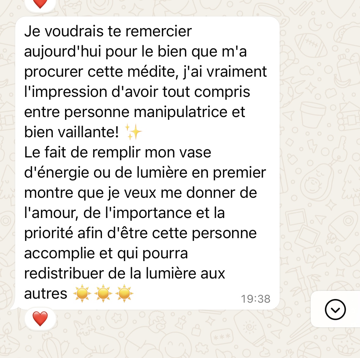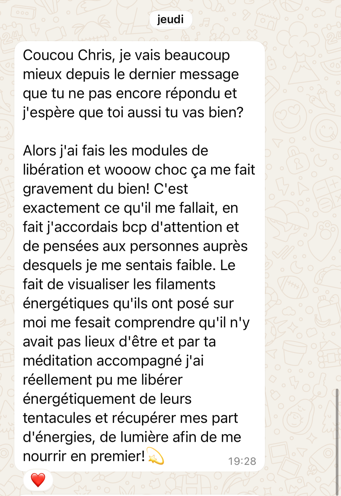 Il y a également certaines des méditations que j’ai directement canaliser de mon Higher self, Mon moi supérieur et c’est comme si j’avais reçu l’indication que je devais absolument partager ça dans ce cours pour que tu puisses te libérer de la même manière que j’ai pu le faire par le passé